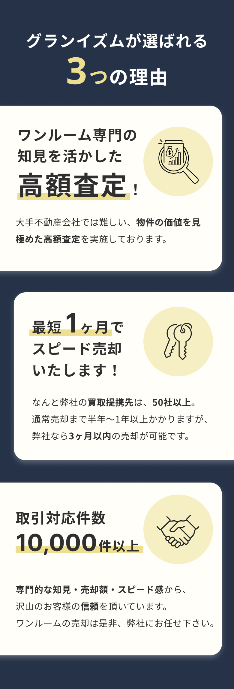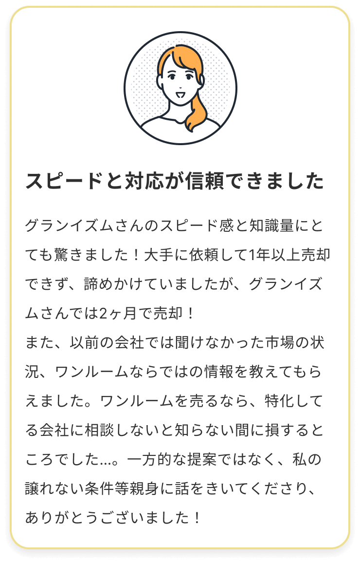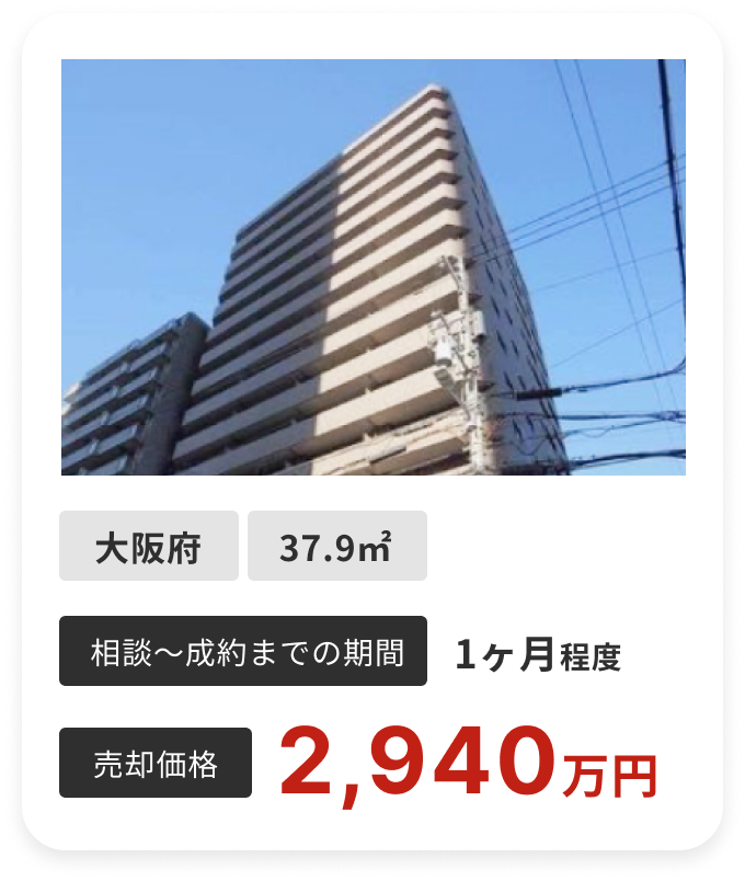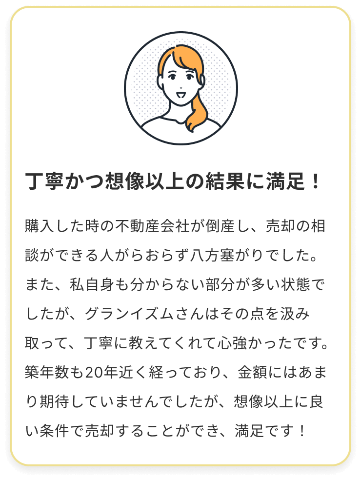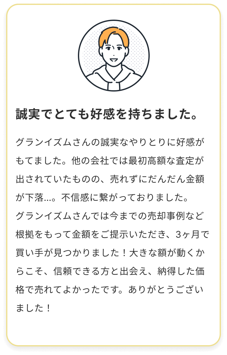 一般的には半年〜1年以上かかる場合が多いです。 グランイズムでは全国のネットワークを駆使し、3ヶ月以内に売却が完了いたします。
